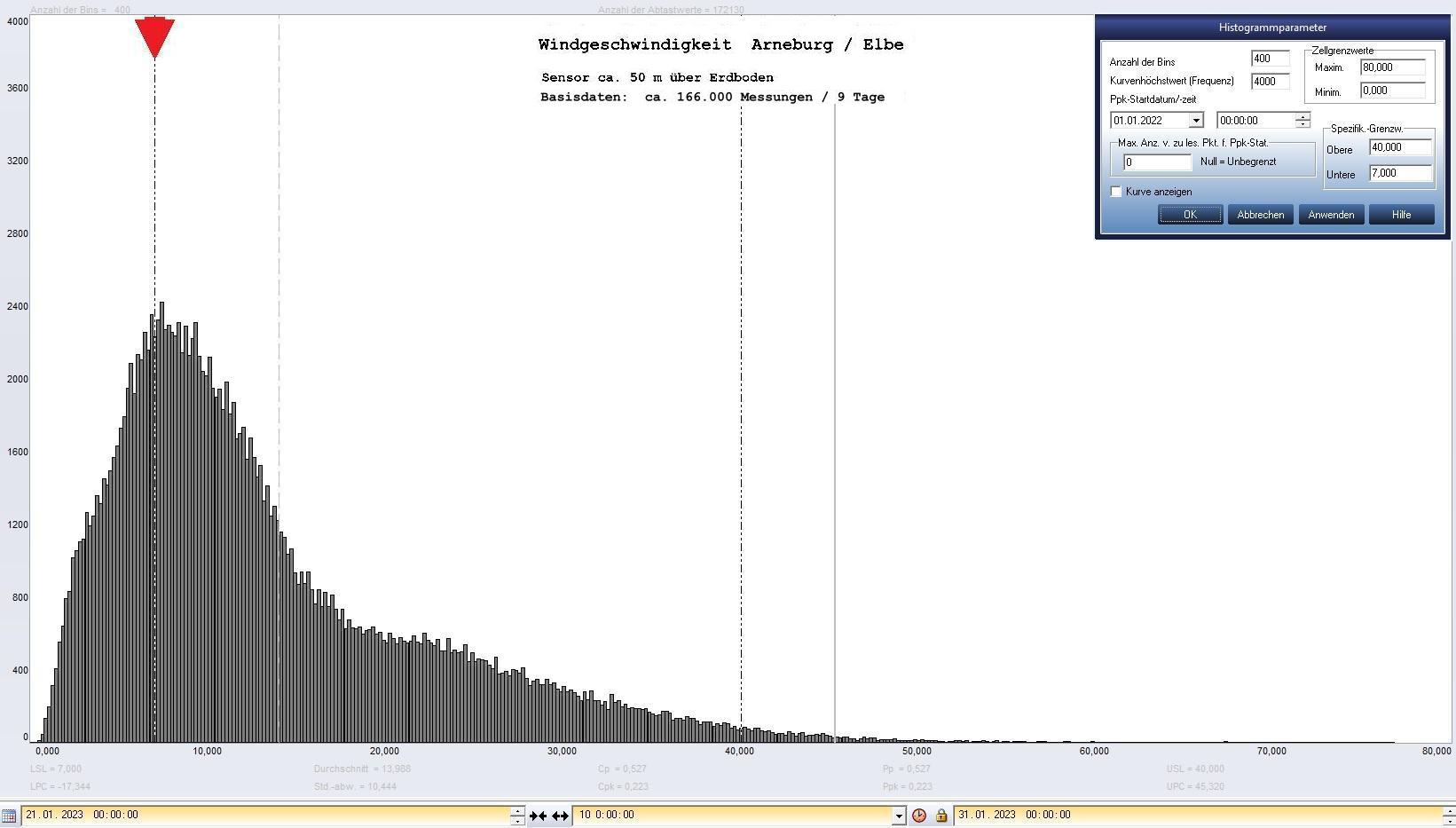 Histogramme Grenzwerte (gestrichelte Linie, roter Pfeil) 7 km/h (Start Energieerzeugung) und 40 km/h