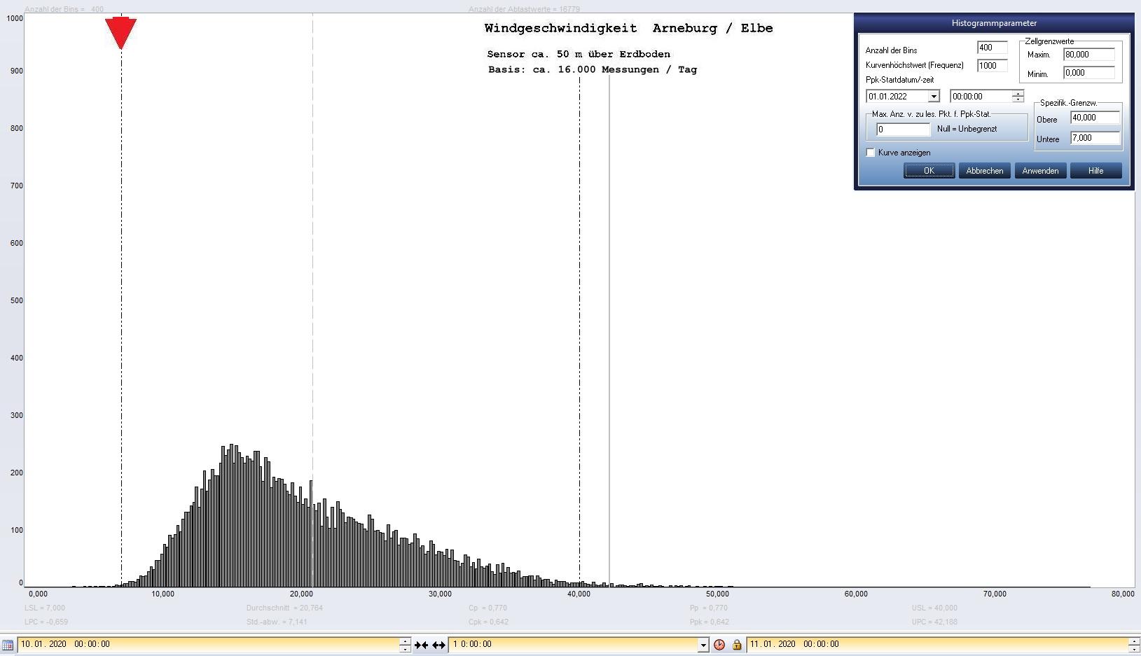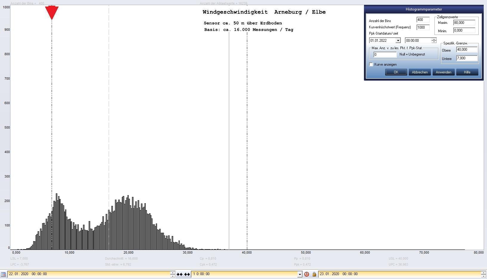 Arneburg Tages-Histogramm Winddaten, 22.01.2020