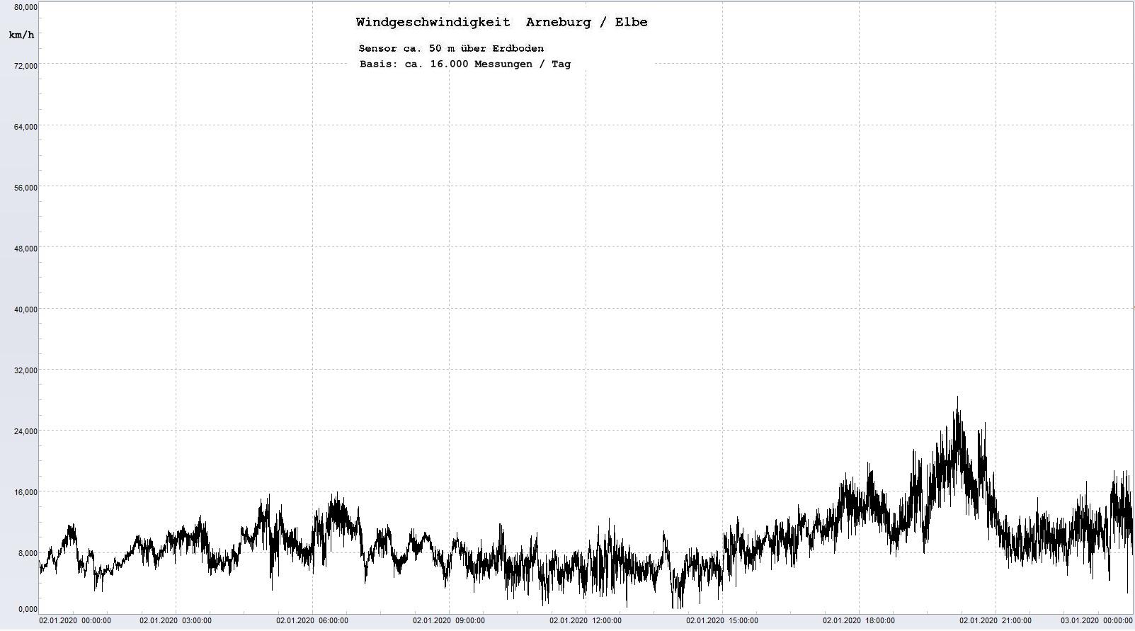 Arneburg Tages-Histogramm Winddaten, 02.01.2020