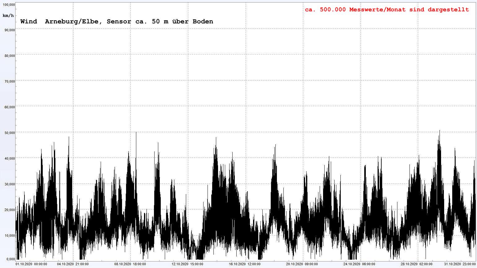 Arneburg Winddaten Monat Oktober 2020, Sensor auf Gebäude, ca. 50 m über Erdboden, 5s-Aufzeichnung